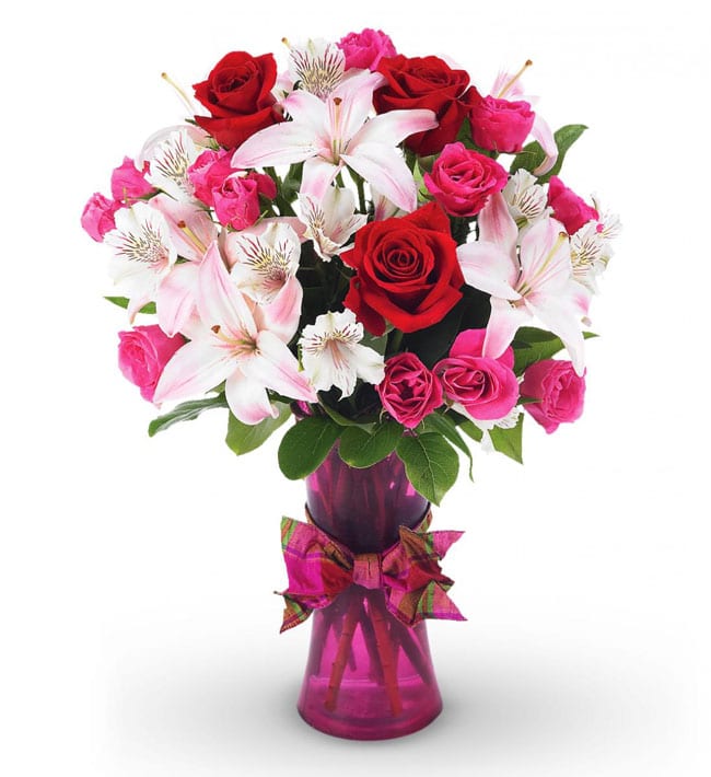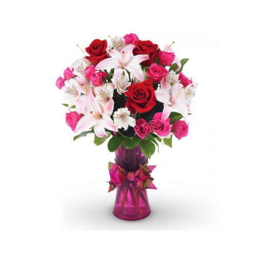 The true beauty of this bouquet is within the sweet colors of the flowers. An array of mixed colored roses, alstremeria and lilies in a vase, making a wonderful gift to light up the face of its recipient.