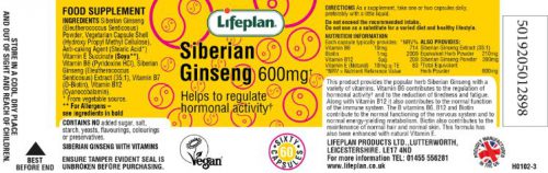 Ingredients: Siberian Ginseng (Eleutherococcus Senticosus) Powder, Vegetarian Capsule Shell (Hydroxy Propyl Methyl Cellulose), Anti-caking Agent (Stearic Acid*) Vitamin E Succinate (Soya**), Vitamin B6 (Pyridoxine HCl), Siberian Ginseng (Eleutherococcus Senticosus) Extract (35:1), Vitamin B7 (D-Biotin), Vitamin B12 (Cyanocobalamin).