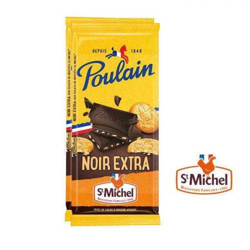 Poulain Noir Extra Saint Michel c’est l’alliance et le savoir-faire de deux marques françaises dans une tablette de chocolat noir aux éclats de biscuits, un résultat ultra gourmand pour toute la famille ! Lot de 2 tablettes de chocolat Noir Poulain Noir Extra Saint Michel 95g